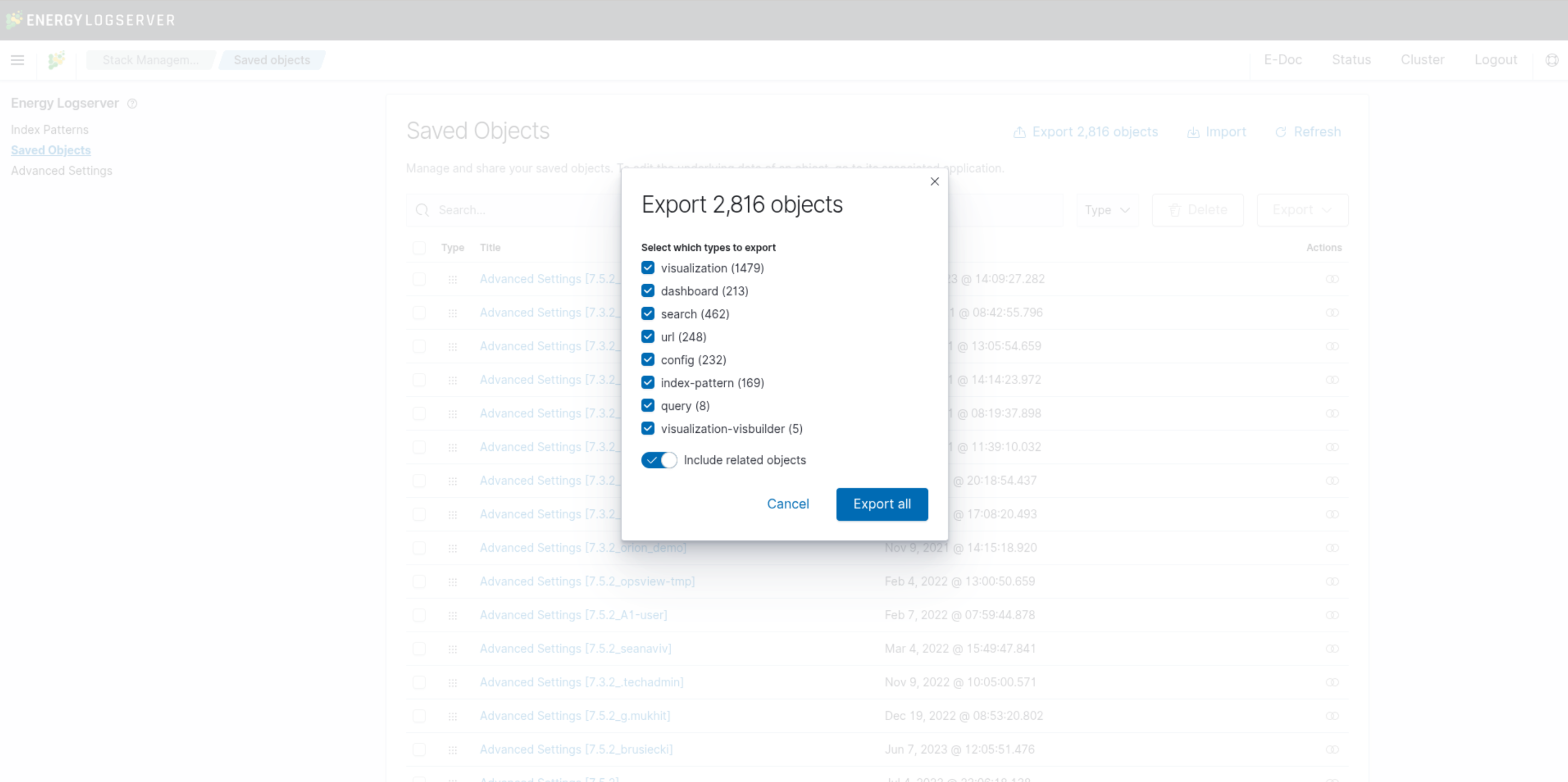 .ndjsonfile. The export panel includes an Include related objects toggle (enabled by default)