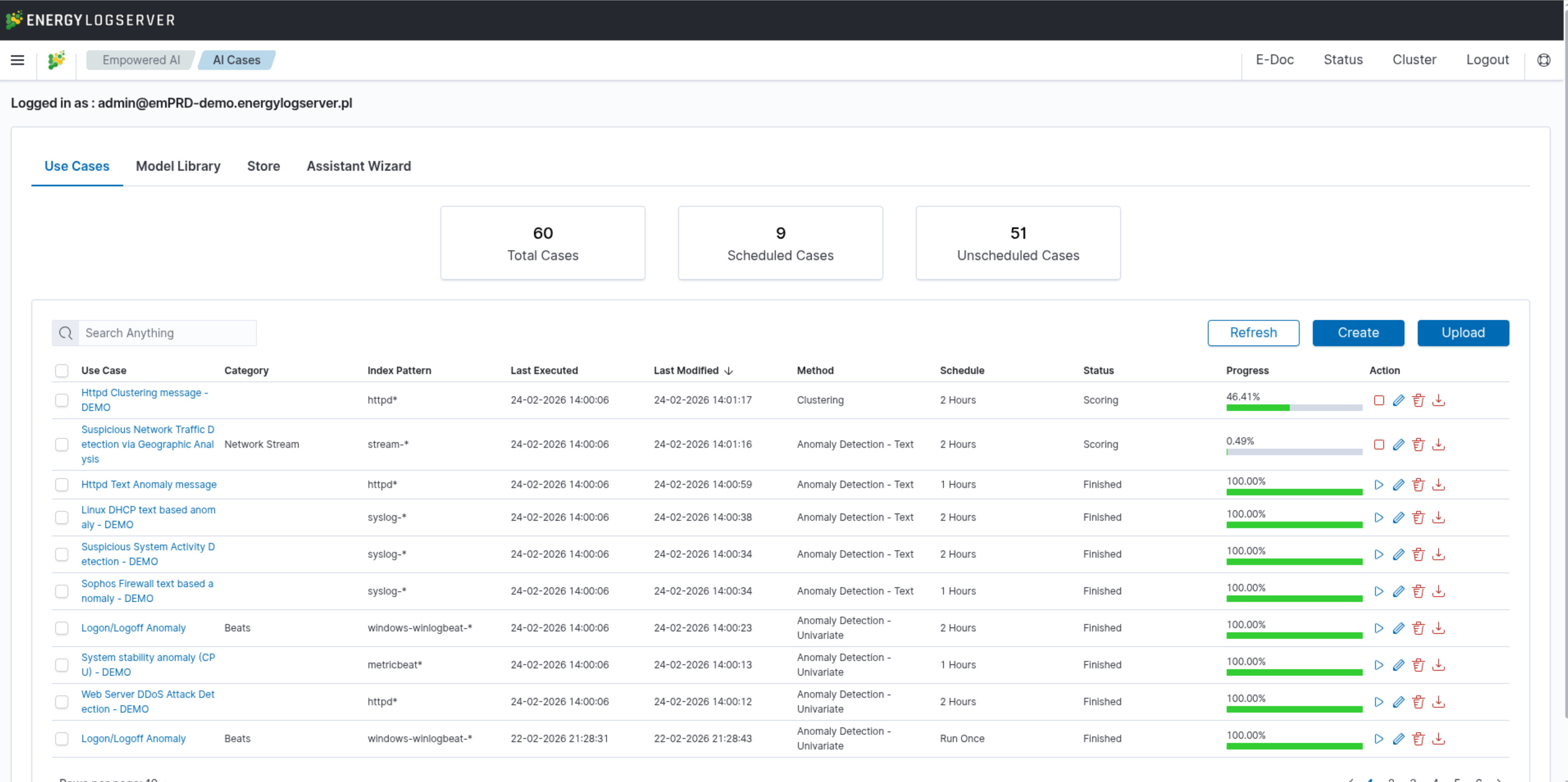 In the Empowered AI section you will find a summary of the existing use cases, connecting rules and data to work with. At the top, you’ll find the total number of configured cases and the number of scheduled and unscheduled cases. Here is the search field and buttons Refresh, Create and Upload.
