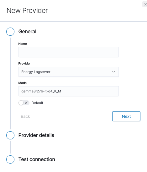 Energylogserver comes with predefined LLM connection that operates in our data center. Energylogserver LLM comes at no cost and allows You to use AI features in a controlled and secured way. You can use that provider while Your system in unders support agreement. Communication is encrypted, and we do not record Your prompts. If You want to process AI locally we encourage You to purchase AI on Prem, hardware AI model ready to operate from Your computer rack. Additionally we support open AI, Fireworks and Ollama. Configure Your model in Provider section. Choose its URL, model name, other atributes.